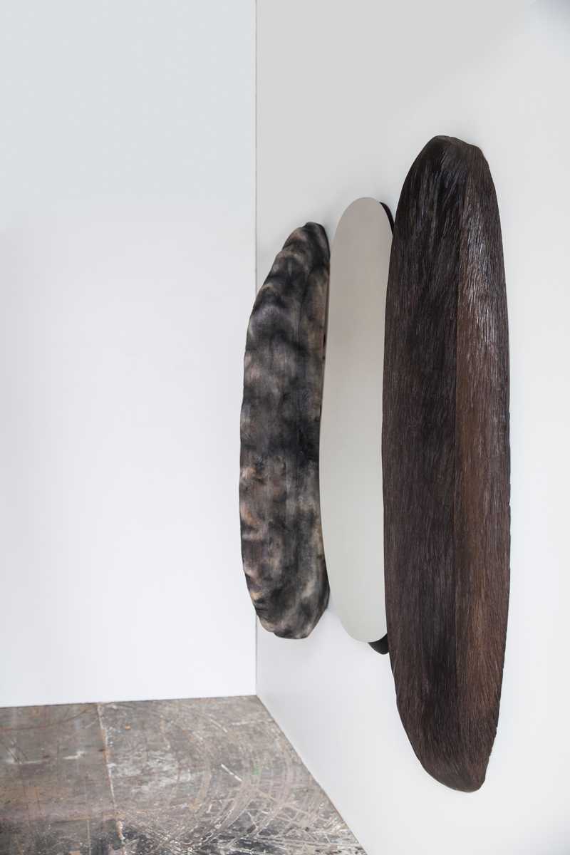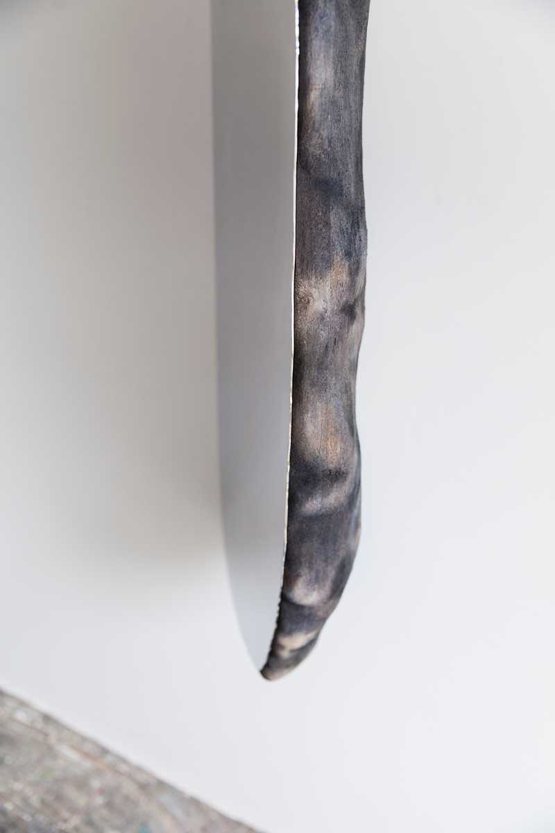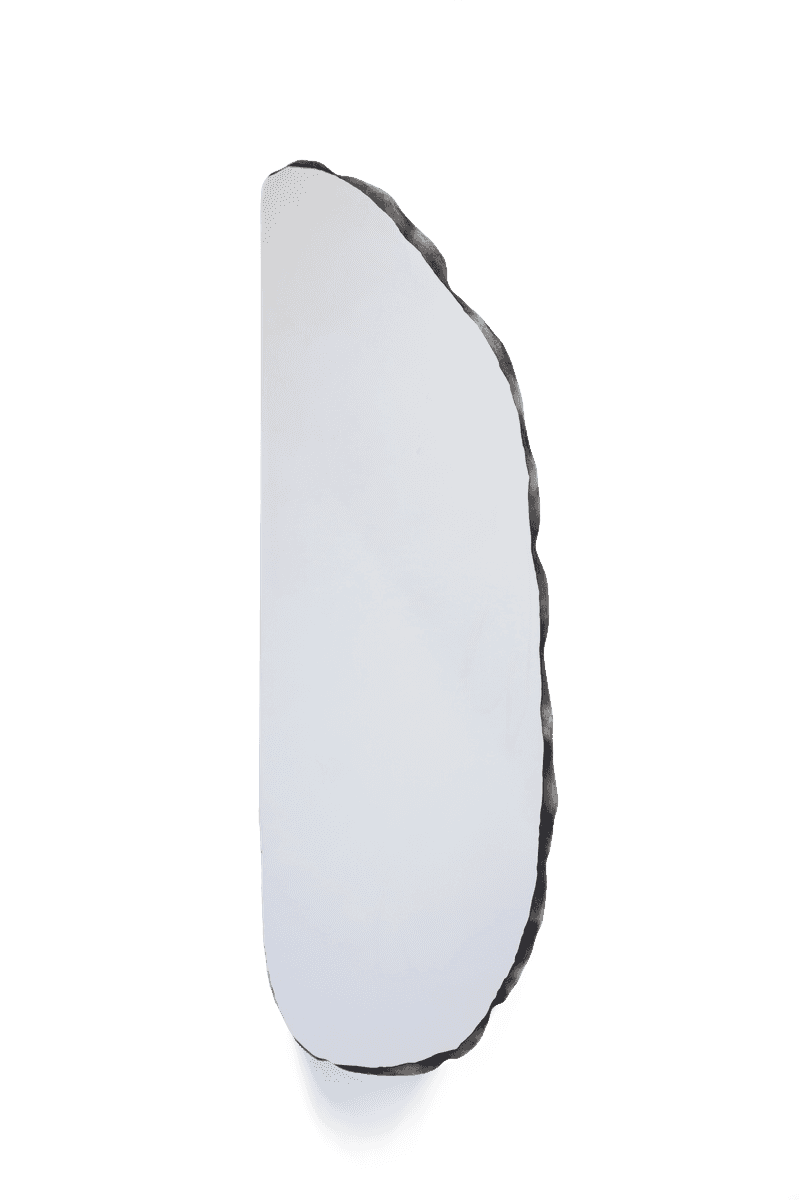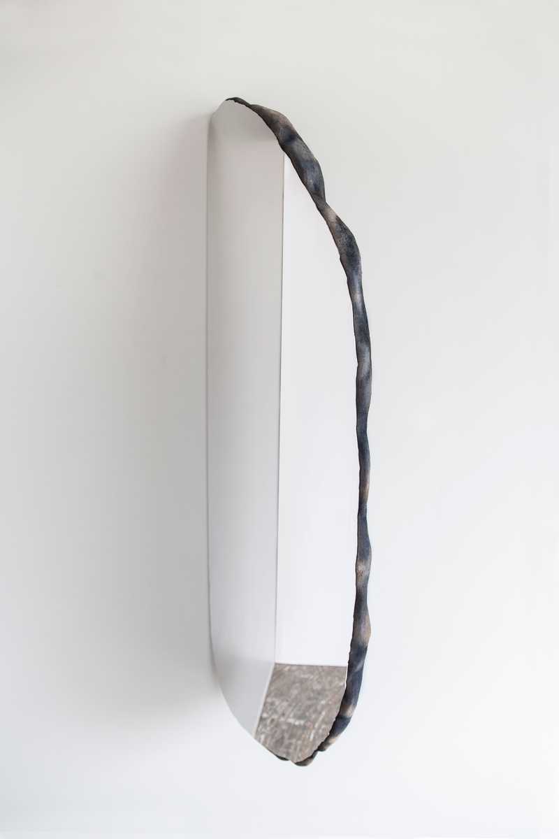 Fragment 2.2 is one of the first sculptured mirrors from the newest series of works where the artist explores the notion of touch by investigating the relation between the object, the elements of space and the human body within that space. The mirror that was supposed to hang flat on the wall wants to break off from it. In result, it is neither a free standing three-dimensional object nor a wall hanging mirror. It is in motion. This position creates a new situation, when one can stand in front of the mirror or in the undefined new space behind it.