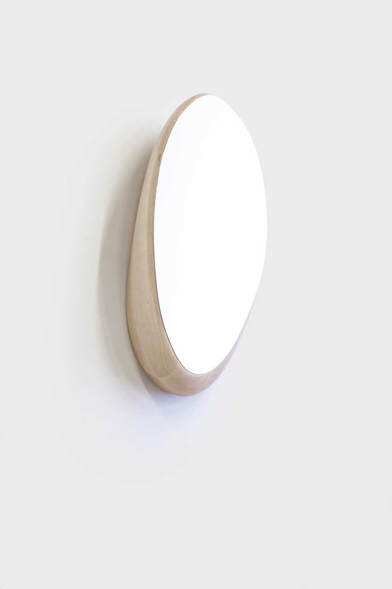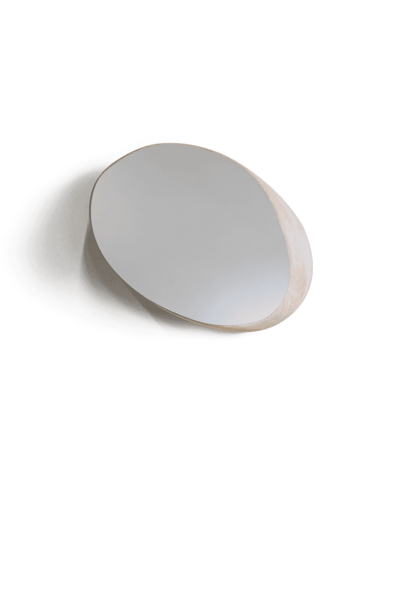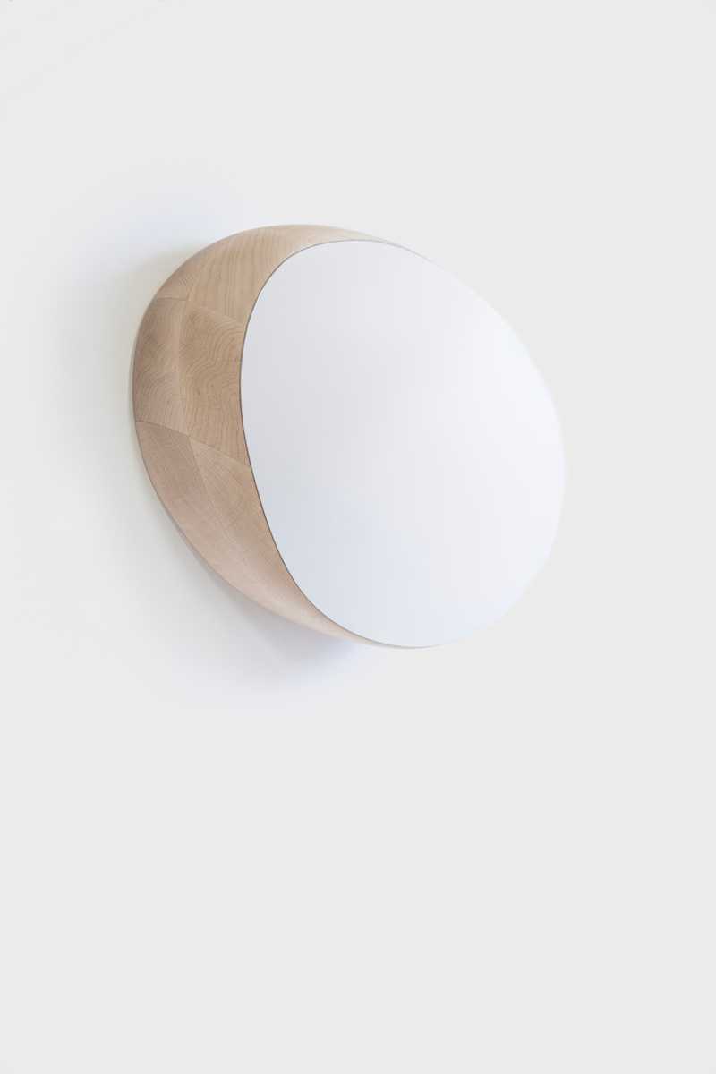 Very Even Stillness is a collection of wall-hung sculptures that may perform the function of mirrors. The small mirror pane attached to the heavy sculptured forms encourages the objects to become decorative mirrors, however due to the proportions between the wood and the mirror they never completely gain the identity of neither a frame nor a mirror. The fact that steel mirror panes are placed at different angles creates an illusion of space; when standing in front of the mirror, one cannot see their reflection, but the space on the other side of the room. The objects are absurd, blurring the line between transcendental and real. Each mirror can be easily hung on a wall in 6 different positions thanks to the customized wall hanger. Mirrors can appear individually or as compositions of many elements.