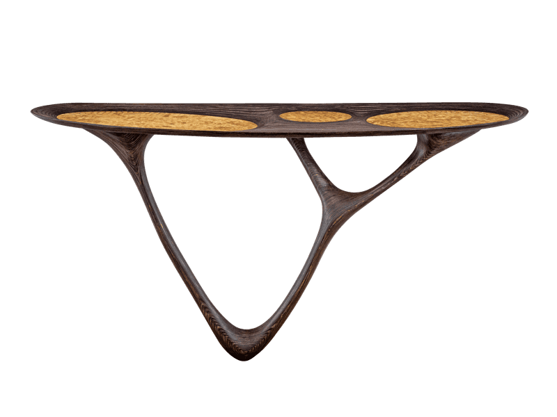 The Linkana II console was designed in 2025, with its design being the result of a quest for an extraordinarily organic and sophisticated yet lightweight and minimalist form for a console. The shape was loosely inspired by hanging vines. The presented console combines a birch plywood leg with an experimental concept for the tabletop. The tabletop consists of several smaller, independent elements that together form a unified surface but with clearly defined boundaries. Each of these resulting "cells" is also made of hand-carved plywood, with a central element crafted in an innovative manner from specially milled brass, serving as the focal point of each cell.