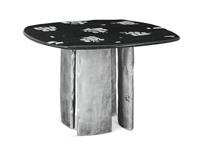 The Taru Dining Table showcases individual stones and minerals meticulously assembled to form a terrazzo tabletop, complemented by four sand-cast, massive aluminum legs. This unique piece has been entirely hand-crafted by the designers. Marble, citrine, jasper and moon stones were carefully arranged into an alluring composition. The smooth finish of the tabletop's edges brings to mind stones naturally shaped by a river's flow. In crafting the aluminum legs, the designers utilized their bespoke casting technique, ensuring each leg boasts a distinct shape. The name 'Taru' stems from the Finnish word 'tarista,' which means 'to talk or tell stories'. This piece resonates with an air of enigma and a touch of the ritualistic.