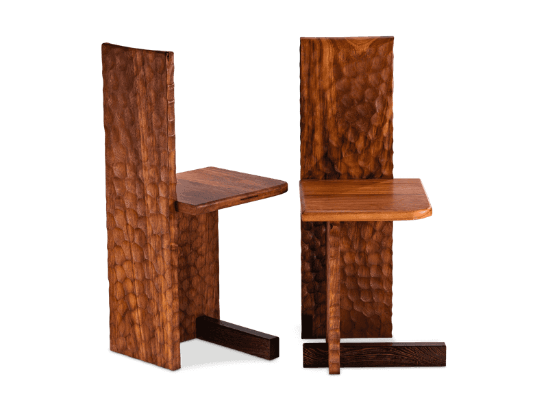 A pair of chairs, in a composition. The chairs are designed so that they can be combined in any way. They can be connected to create a bench or loosely scattered and treated as a sculpture in the interior.