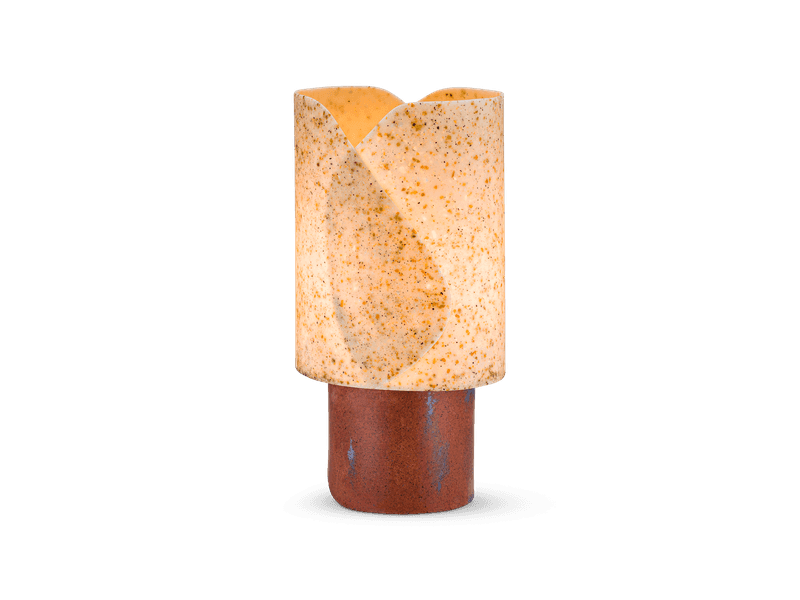 Crafted entirely from material consisting of coloured recycled glass particles and pigmented biobased resin the lamp presents a distinct range of translucence. The dimmable light reveals glowing contours of form, transforming the lampshade from opaque and dense when it’s turned off into shimmering and airy when it’s on. With its deeply saturated hues but also blurred and gentle glow the lamp creates an atmosphere of warm tactility for the interior. The shape balances the modern simplicity with sensual lines of wrapped, leaf-like surfaces and the technicality of the cord fixture is gently elevated as an integral component of the design.