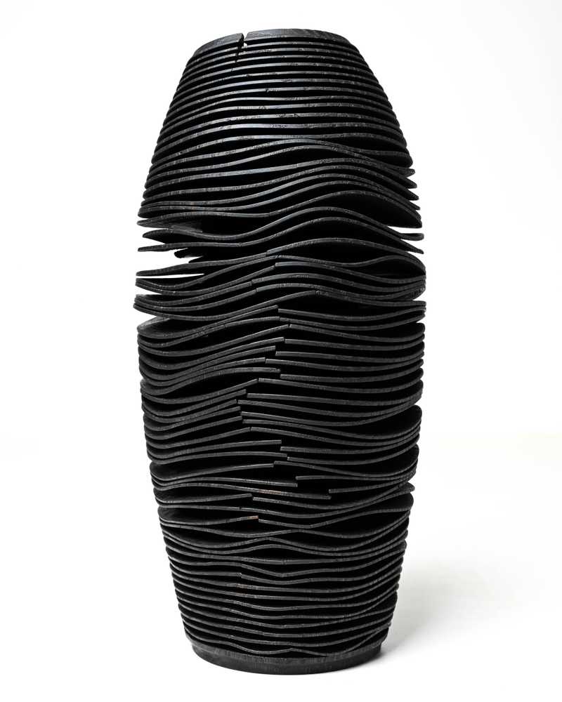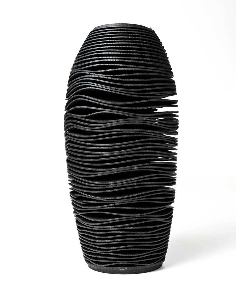 A wooden vase of exceptional character, embodying the fusion of craftsmanship and the forces of nature, captures attention with its symbolic form. The vessel features a hollowed-out center, directing all focus to the outer surface. Its thick walls are adorned with precise, evenly spaced, and deep grooves that form flat, concentric rings. The natural drying of the wood introduces an element of unpredictability, giving the shape a unique and dynamic appearance. The creation process is a harmonious dialogue between craftsmanship and nature, where the natural distortions ultimately define the object's final form.