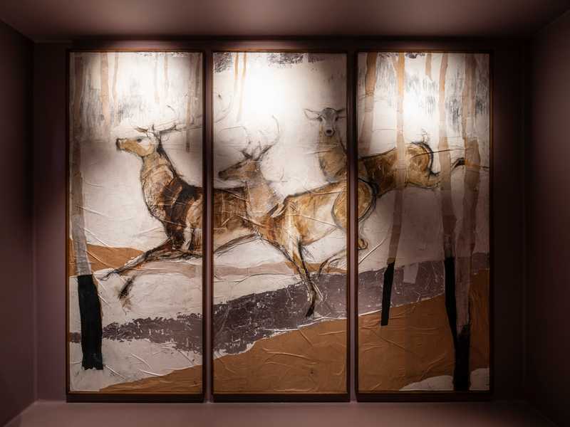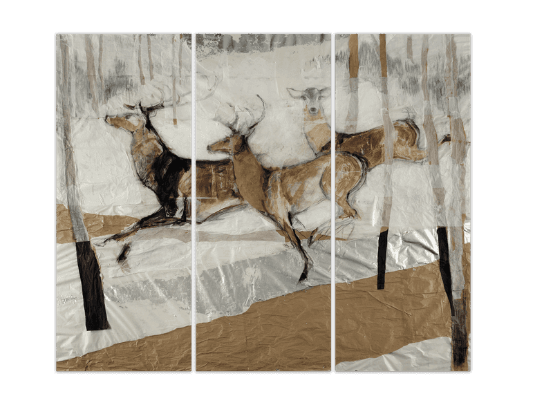 Michał Zaborowski's triptych is a remarkable work that combines collage techniques with inspirations drawn from nature. The artist used a variety of papers – ranging from delicate Japanese paper to raw recycled paper – to create a dynamic composition featuring running deer. The scene evokes the untamed beauty of Poland's mountainous wilderness, depicted in motion and full of primal elegance. The use of contrasting textures and shades of paper enhances the organic character of the piece, while the natural color palette and precise details capture the spirit of the mountain landscape. This work is a perfect blend of traditional craftsmanship and modern artistic sensibility. It reflects the artist's deep respect for nature and his passion for experimenting with materials.