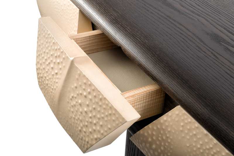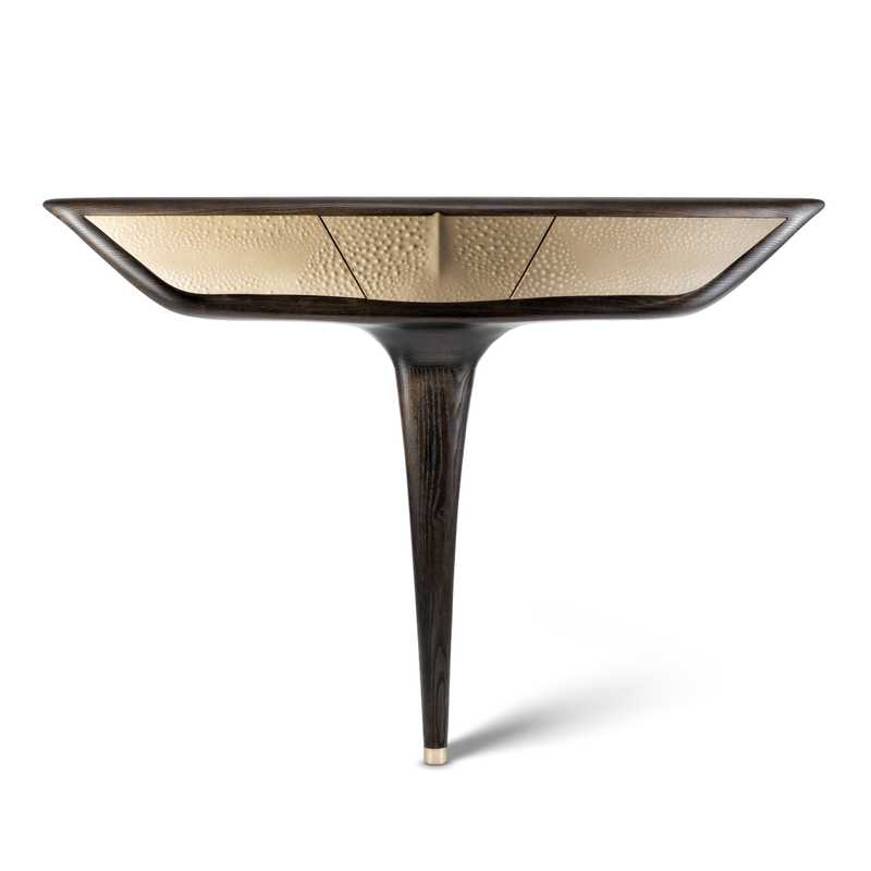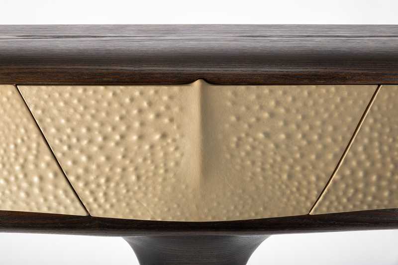 A sculptural console created by Palucki Studio in collaboration with a fellow Polish designer Tomasz Omachel. Hand-carved from solid ash wood and finished in a smoked tone, the piece features drawers clad in natural parchment leather applied over carved organic reliefs.