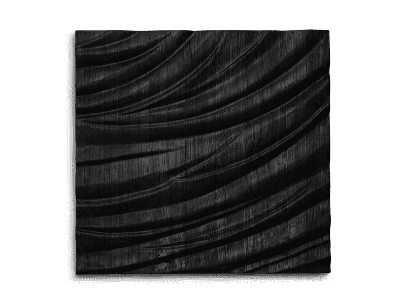 The artist reimagines the properties of softwood, a material commonly used in construction. In his experiments, he often works at the edge of the wood’s fragility, testing and expanding its structural limits. In creating the MIZU reliefs, he focused on the process of transformation, constantly exploring how the material reacted at each stage. Naturally pale spruce takes on unexpected dark hues, through a meticulous, multi-step process of burning, oiling, and brushing, highlighting both its resilience and subtle beauty.