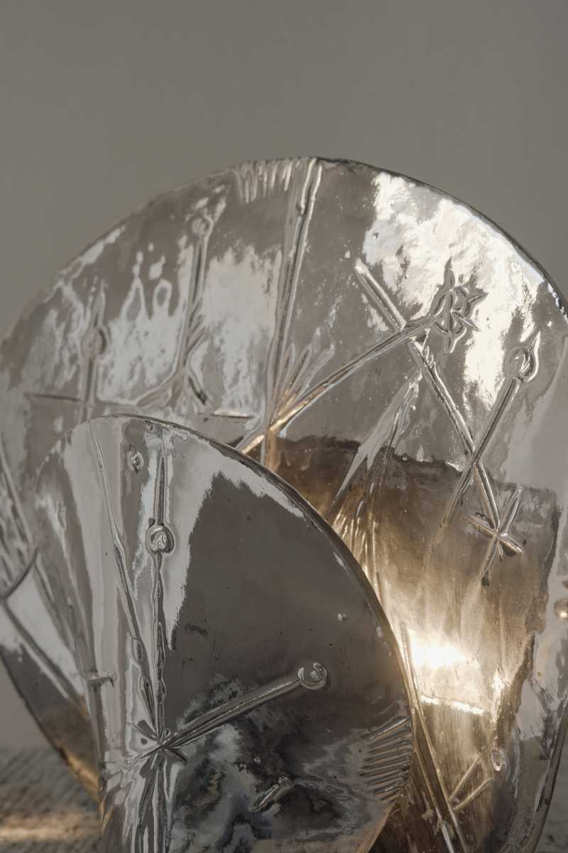 Techniqueclay, hand-sculpted, embossed, platinium-coated, fired. Electrical components (including a light bulb and electrical fittings)