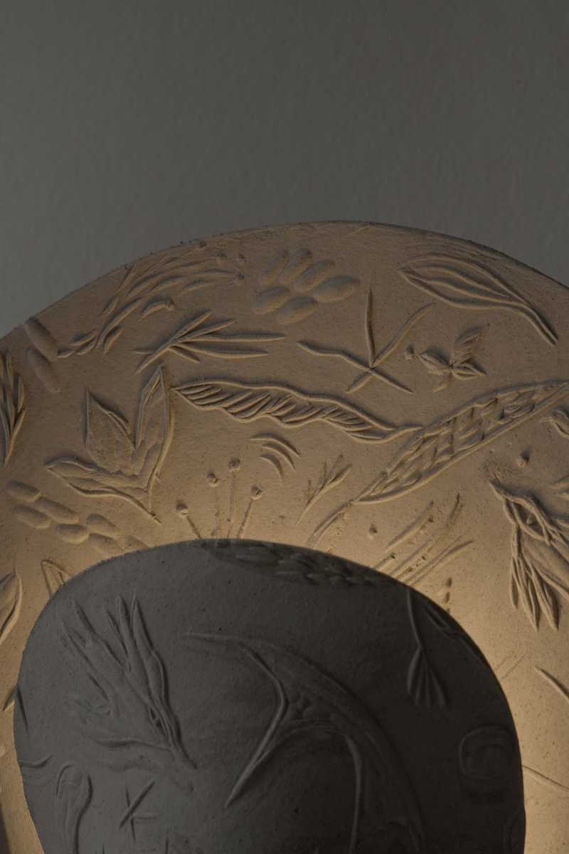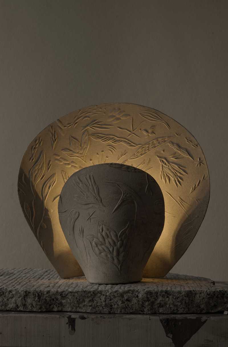 Each lamp is hand-sculpted using various types of clay and then individually fired, resulting in subtle variations that make each piece unique. Some of the lamps are glaze-finished, while other are left in their raw, natural form, enhancing the texture and look of the used material. The lamps are decorated with embossed reliefs, created by pressing a hand-carved chisel-cut matrix into the surface. Lueur is a tribute to nature – a fusion of the brutalist simplicity of sculpted, fired clay with romantic decor. Every stage of the lamp’s creation is entirely handcrafted, reflecting a meticulous, craft-driven approach.