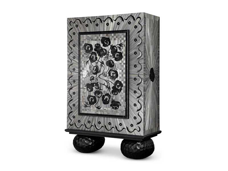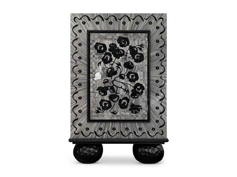 The cabinet, crafted from oak and straw marquetry, combines artisanal precision with a bold, ornamental form. The body of the piece rests on two solid legs, which lend the object both stability and a sculptural presence. The front features a single door that serves as the primary decorative surface. At the center of the door appears a motif of black roses, presented as a striking, high-contrast composition. The subtly shimmering straw marquetry forms the background for the floral pattern, enhancing the depth and rhythm of the design.
