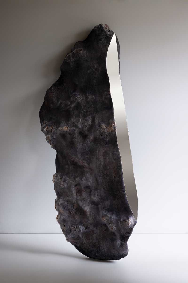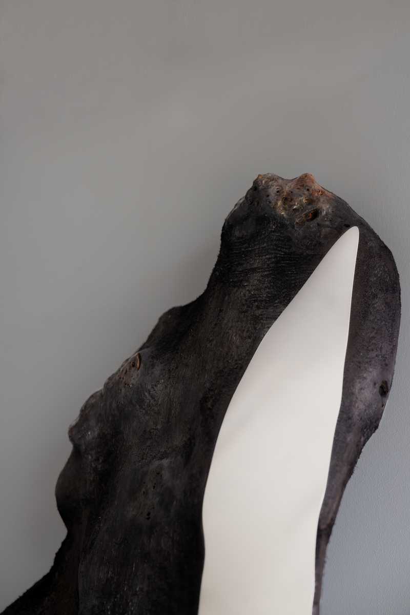 Rzeźba została ręcznie wyrzeźbiona z niewielkiego monolitu czeczoty topolowej, zgodnie z naturalnym skrętem włókien drewna. Miększe partie zostały usunięte, podczas gdy gęstsze fragmenty czeczoty pozostały gładkie i wypolerowane, tworząc wyraźny kontrast między fakturą przypominającą futro lub włosy a powierzchniami kojarzącymi się z kamieniem lub metalem. Technika polerowania wzmacnia te różnice, tworząc przejścia od matowych, silnie napigmentowanych fragmentów do subtelnych lub lustrzanych refleksów w odcieniach błękitu, czerni, purpury i czerwieni.